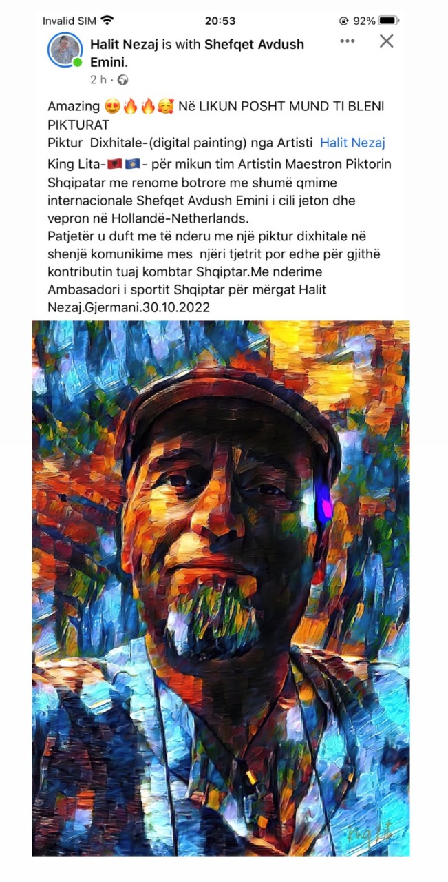 Kjo pikturë e realizuar nga artisti i njohur ndërkombëtarisht, Shefqet Avdush Emini, është një portret ekspresiv i krijuar me një qasje unike dhe një stil të dallueshëm, i cili karakterizohet nga ngjyra të guximshme, kontraste të forta dhe lëvizje të lirshme të penelit.